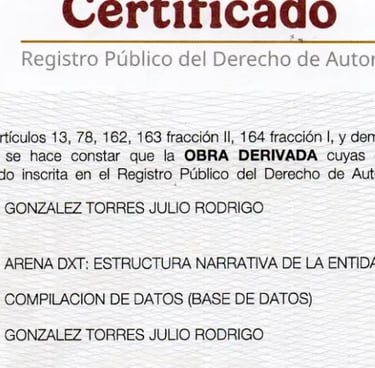 La obra " El fundador de DestruXion Total - Arena " se encuentra en registro ante INDAUTOR, ya que ARENA DXT es basada en esta obra, se desea proteger el concepto para entrar a un mundo profesional, y poder crecer cómo proyecto. Teniendo una misión más grande detrás que se encuentra en proceso de planeación.